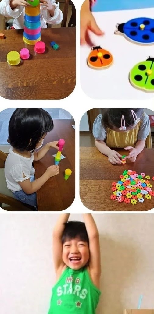 カード、パズル、つみ木、絵本などの知育教具を使って、「色・形・数・大小・空