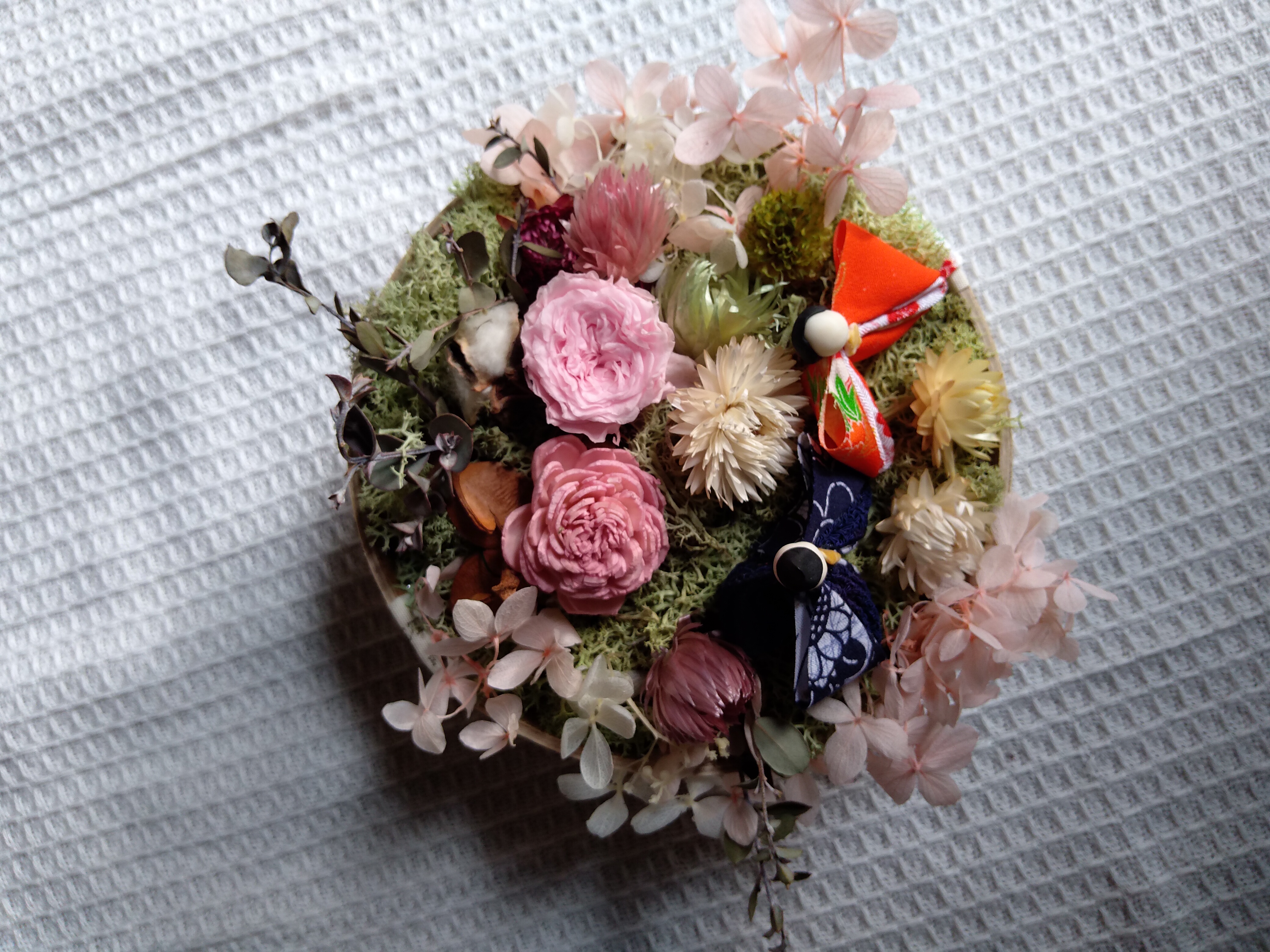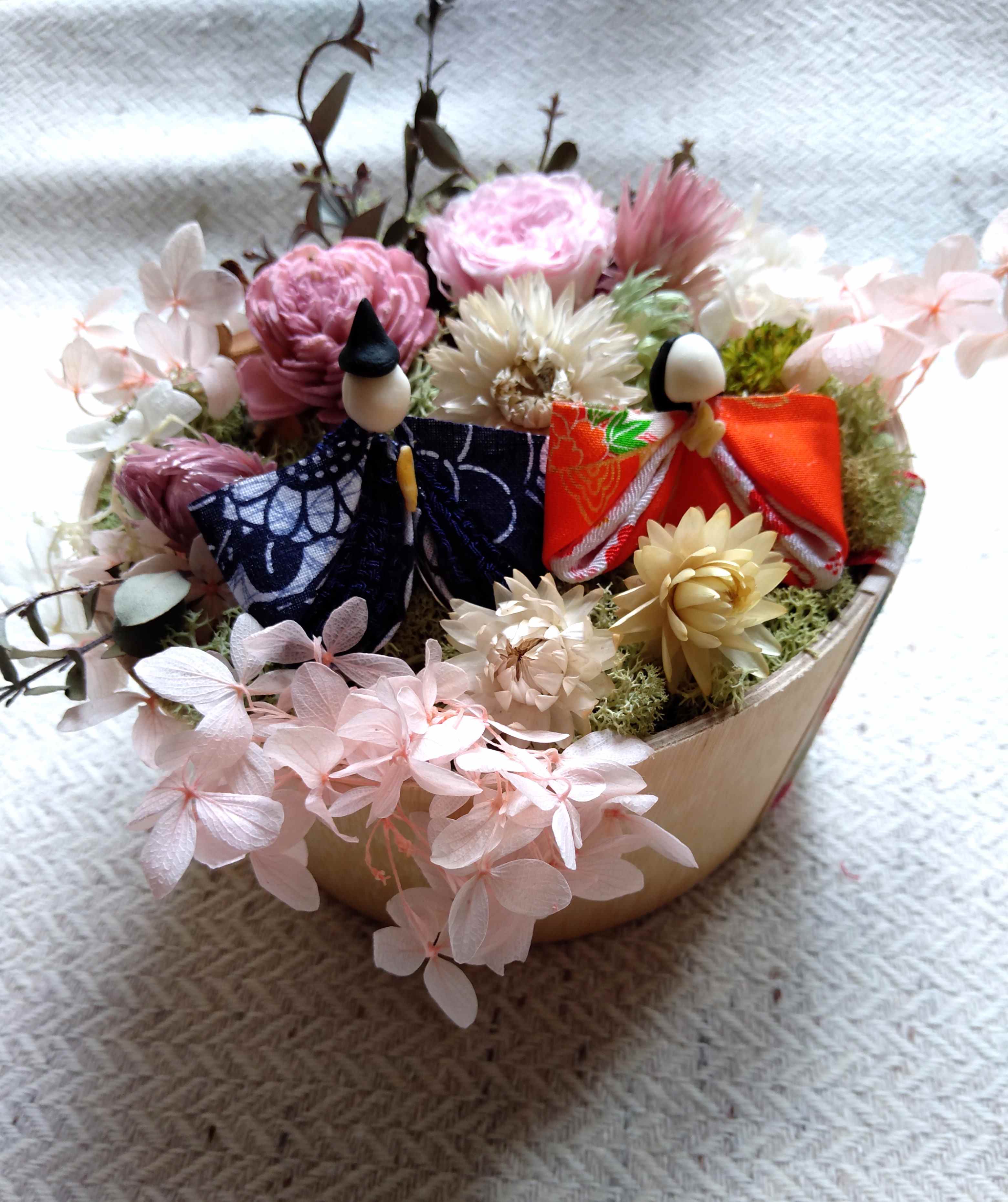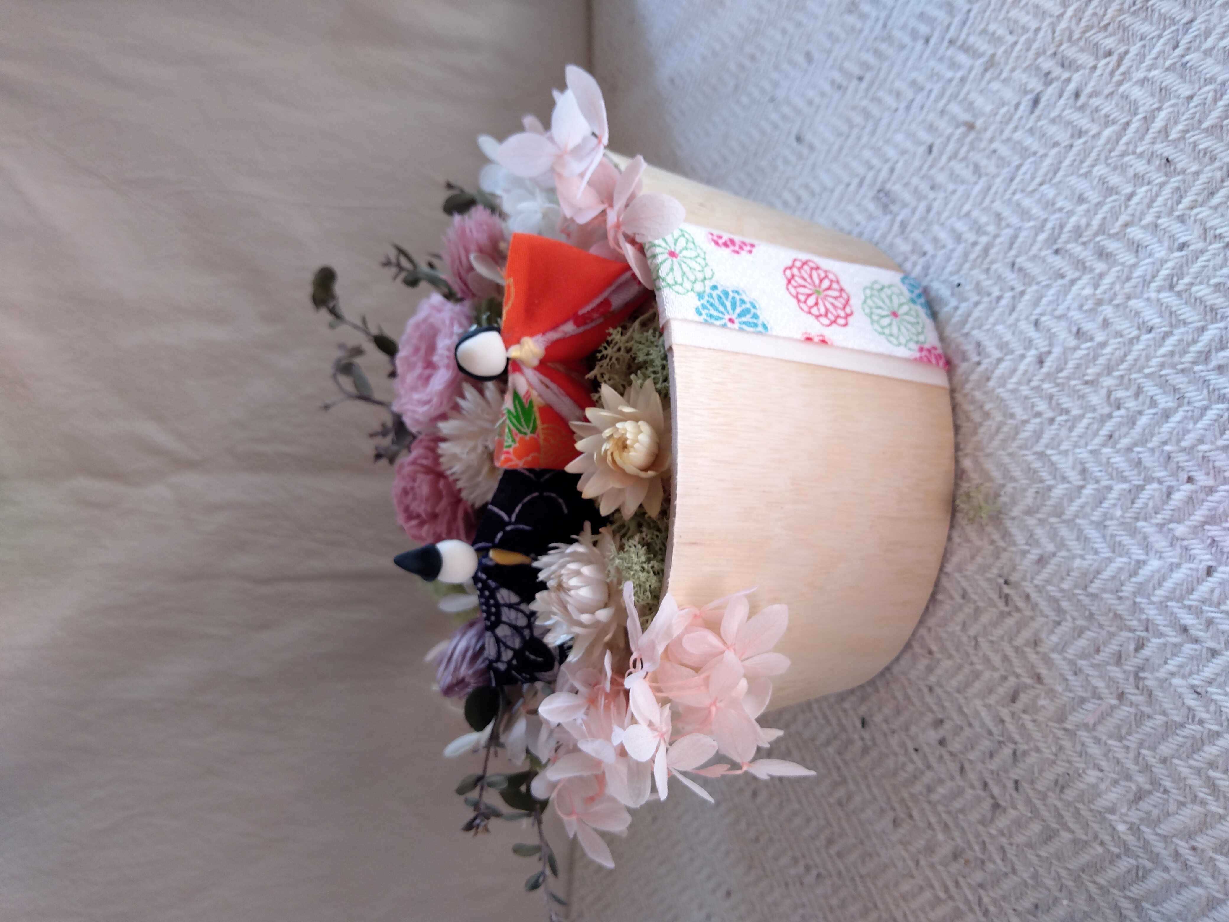 お雛様をプリザーブドフラワー、ドライフラワーでФ15.5cmにアレンジします。