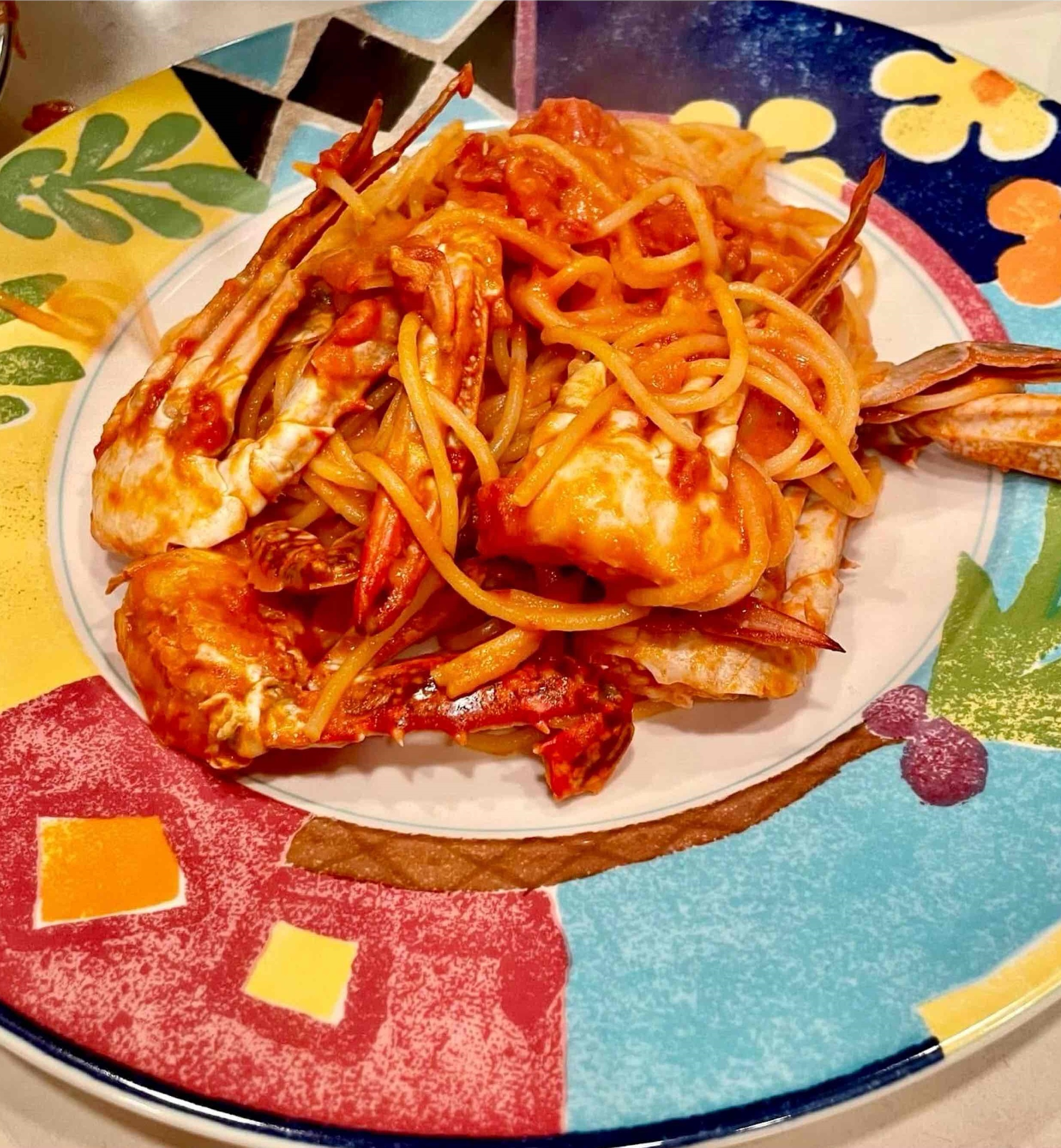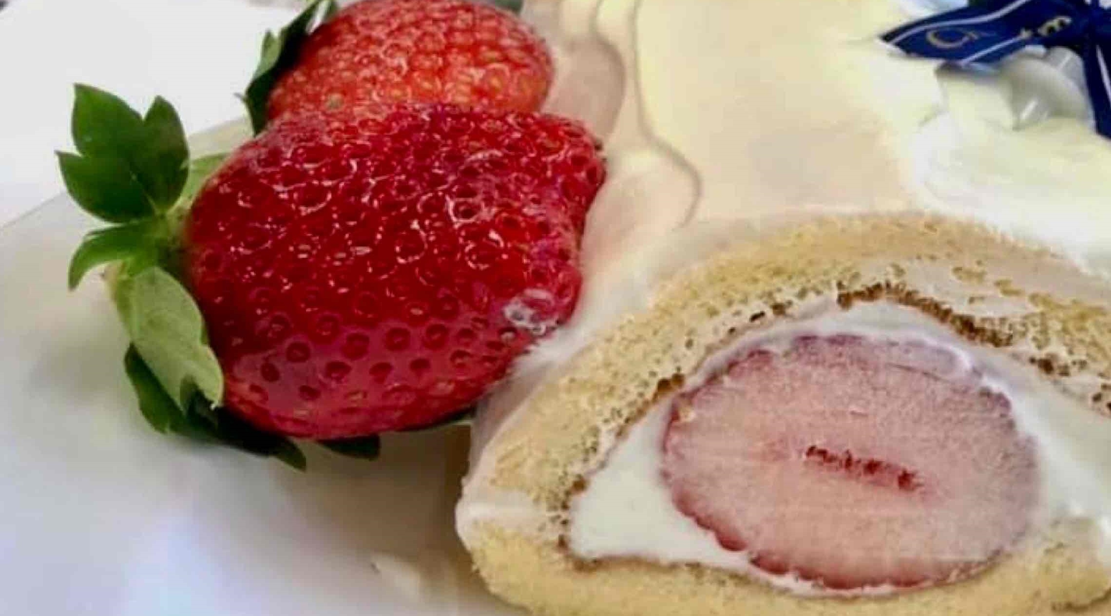 渡り蟹のトマトクリームパスタ、季節野菜のスープ、いちごのロールケーキ