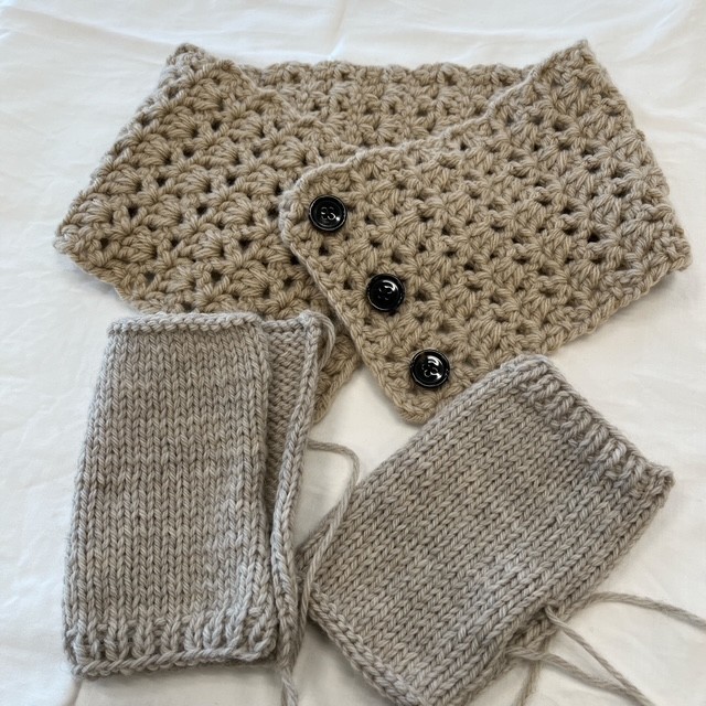・初回は棒針編み・ハンドウォーマーと、かぎ針編み・ネックウォーマーを作ります。