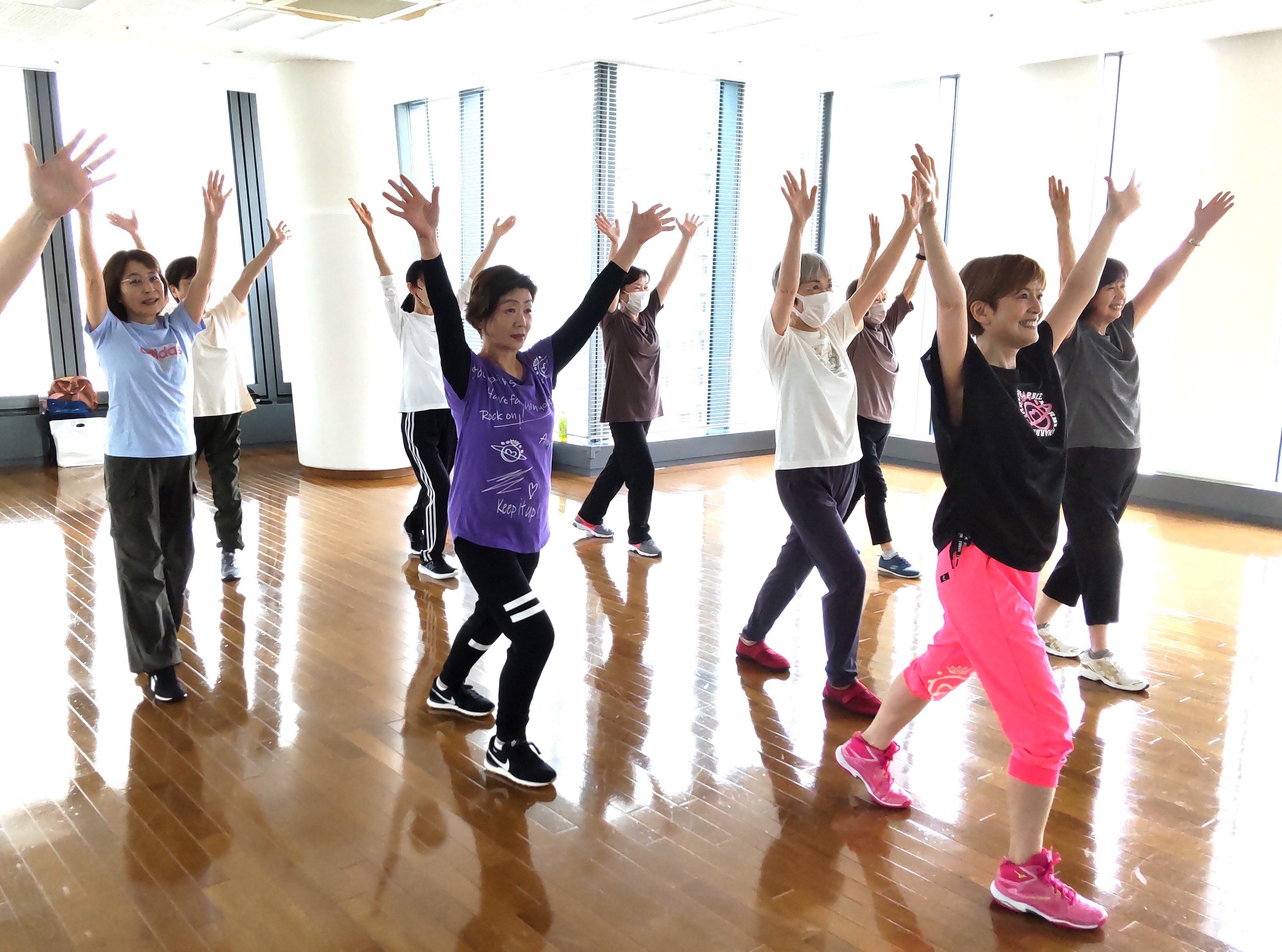 ゆっくりとしたテンポの曲を使い、リズムダンス、簡単な筋力トレーニング、ストレッチとトータルに身体を動かしていきます。