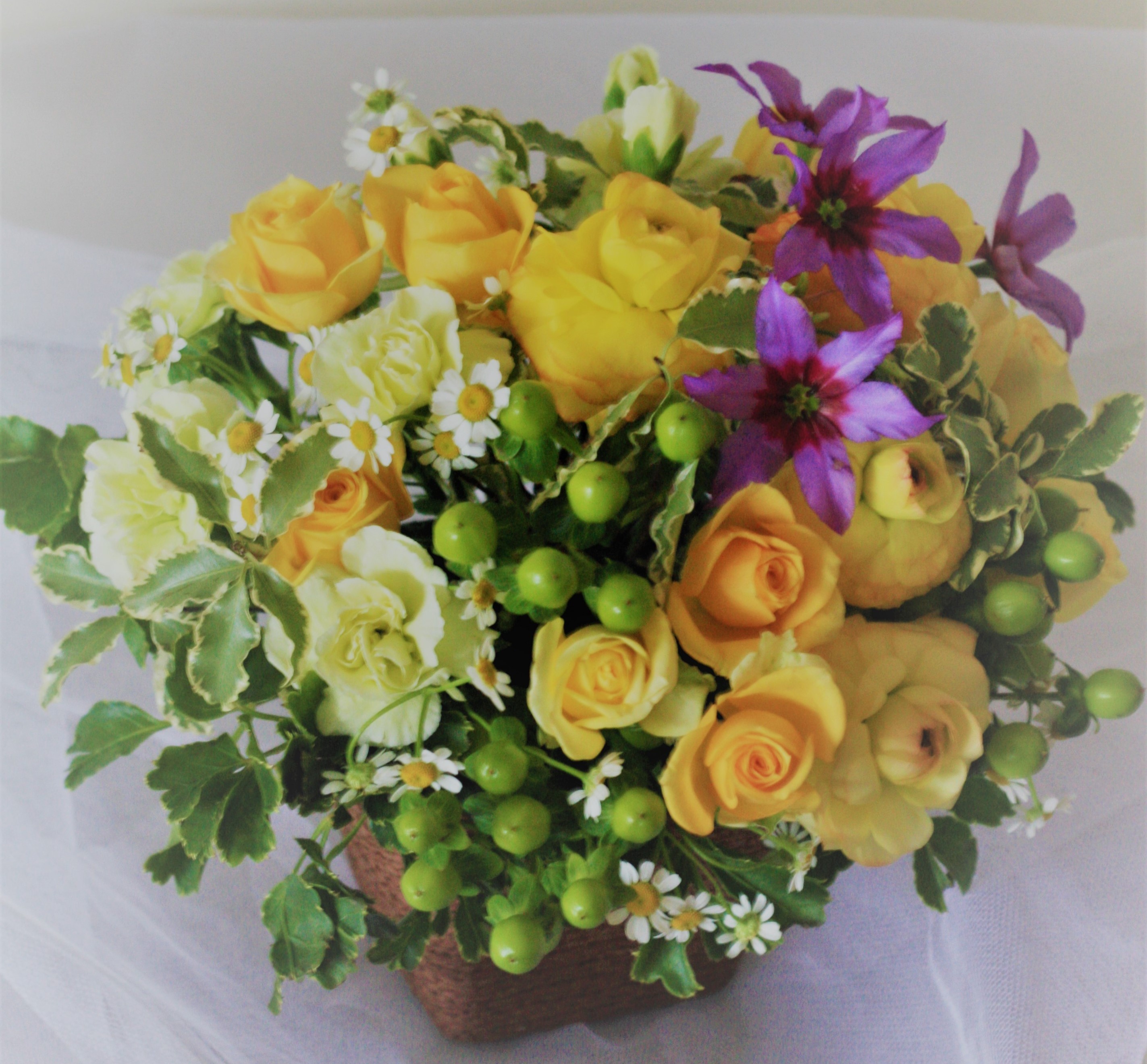 季節の生花を使って、初心者も経験者も楽しんでいただき、作品が出来た時の楽しさ、うれしさを感じてほしいと思います。事前に見本を作成し、当日は花材や飾り方を説明しながら進めて、最後に1人ずつ見させていただきます
