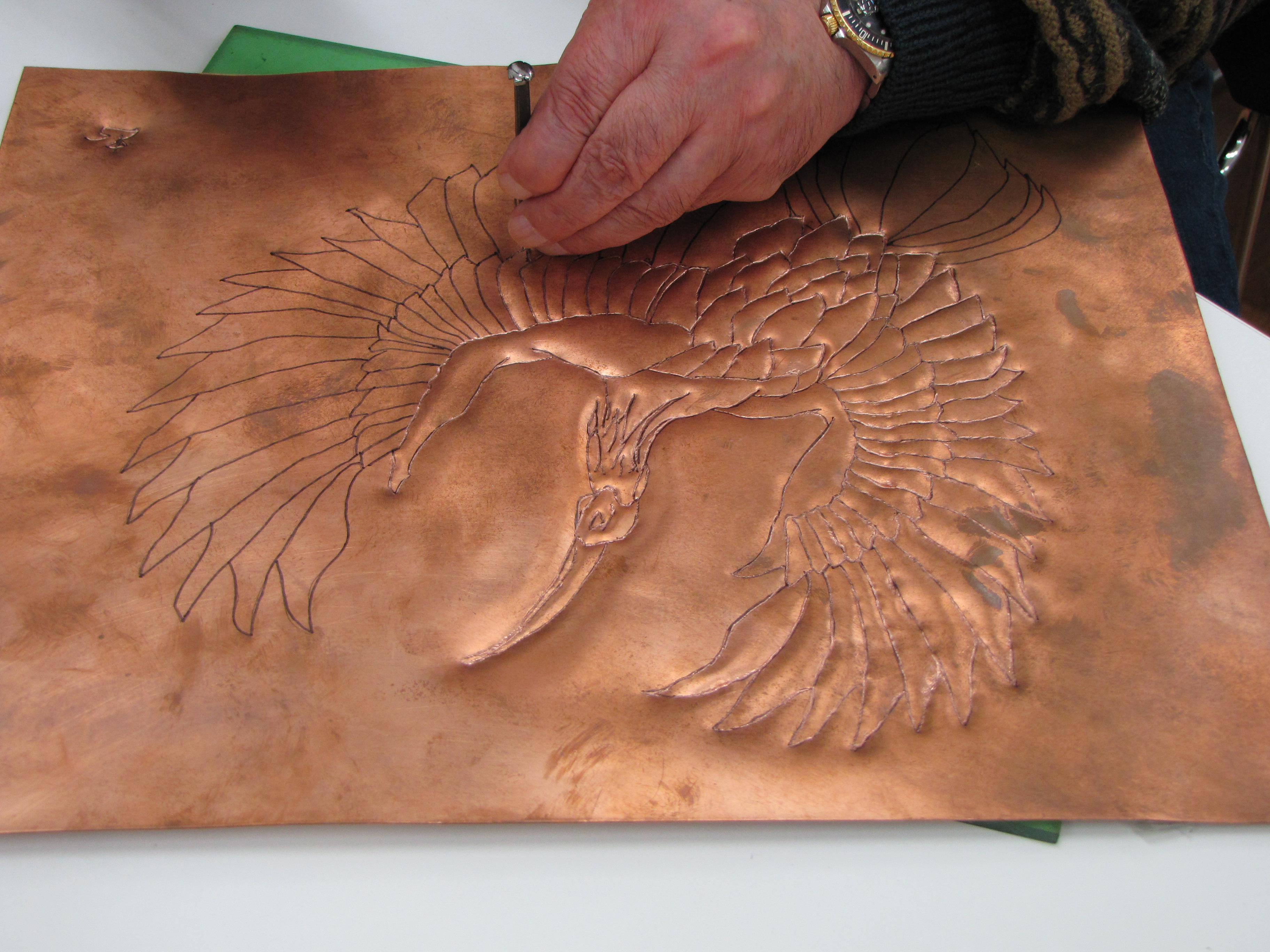 銅板に花や動物などの文様を掘り込み、金工美術作品を作りましょう。彫金は指先の細かい動きが脳の活性化にもつながる効果があります。初めての方にも、わかりやすくお作りいただけます。