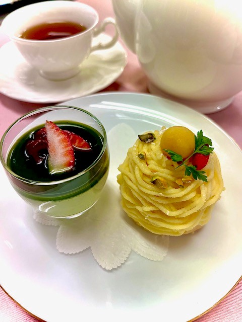 【me-gaco】中華のシェフのスィーツ&中国茶(4月期)~さつま芋のモンブラン&抹茶杏仁豆腐~